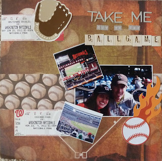 I made this layout for Leslie and Jason and some of the memorbilia she sent me from various dates they have had. For this I used the sketch at Scrap Our Stash blogpost and along with the sketch the challenge was to used mixed alphas on your title. I used a lot of things from my stash including the baseball and glove embellies I've collected from swaps and dug thru all my alphas to find what to use.